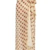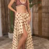 Es una salida de baño tipo pareo largo, confeccionada en tela chiffon transparente de caída ligera y vaporosa. El color base es un amarillo mantequilla suave, muy delicado, y está decorada con grandes lunares marrón chocolate que le dan un aire retro y divertido. Se ajusta en la cintura con un nudo delantero, creando una abertura central que deja ver la pierna de manera sensual y elegante. El corte es fluido, con un movimiento natural al caminar, ideal para complementar un bikini o traje de baño en la playa o la piscina.