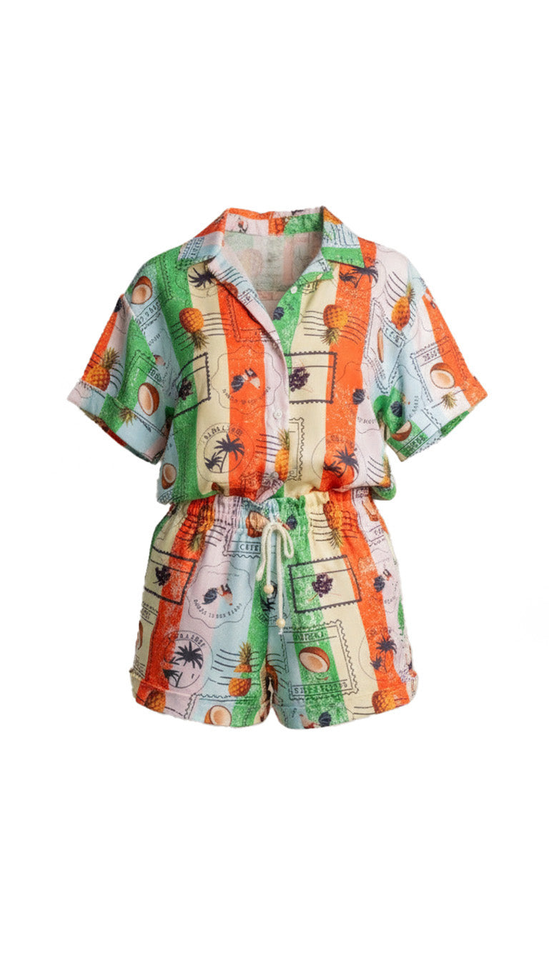 Este conjunto está compuesto por camisa manga corta y short a juego, confeccionados en tela ligera y fresca, ideal para el verano. El diseño destaca por su estampado tropical multicolor La camisa tiene corte recto y botones frontales, mientras que el short cuenta con cintura elástica ajustable con cordón y bolsillos laterales, lo que lo hace práctico y cómodo. Un look vibrante, relajado y moderno, perfecto para días soleados, paseos junto al mar o escapadas vacacionales.