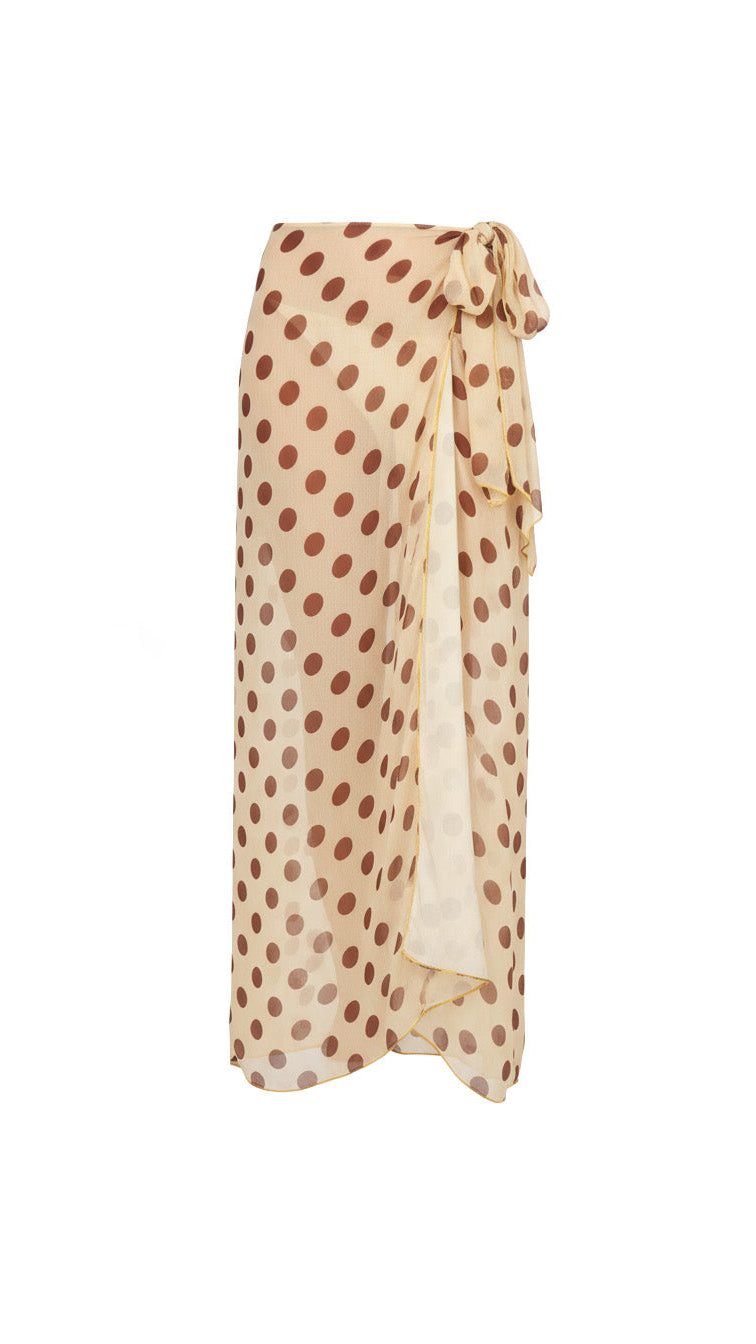 Es una salida de baño tipo pareo largo, confeccionada en tela chiffon transparente de caída ligera y vaporosa. El color base es un amarillo mantequilla suave, muy delicado, y está decorada con grandes lunares marrón chocolate que le dan un aire retro y divertido. Se ajusta en la cintura con un nudo delantero, creando una abertura central que deja ver la pierna de manera sensual y elegante. El corte es fluido, con un movimiento natural al caminar, ideal para complementar un bikini o traje de baño en la playa o la piscina.