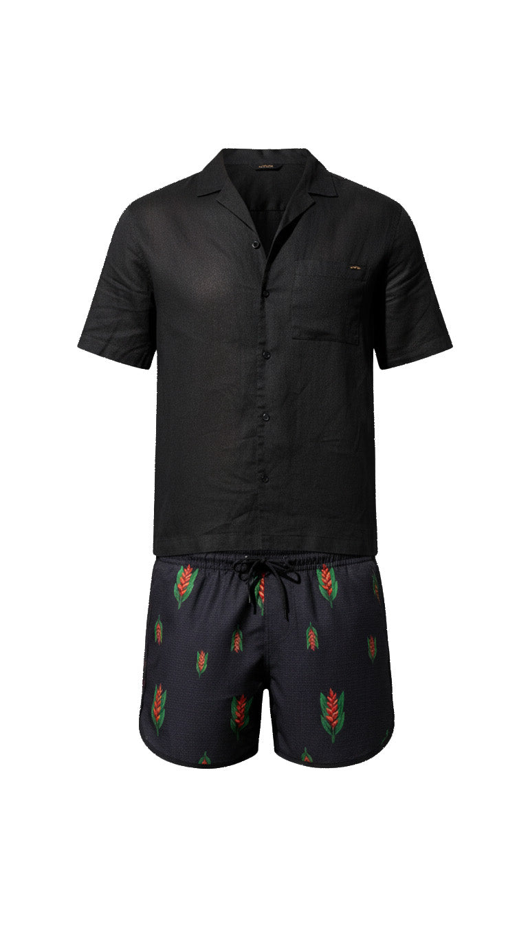 Un look fresco y moderno ideal para días de sol. La pantaloneta en tono negro está realzada con un estampado de heliconias en colores vibrantes que evocan naturaleza y tropicalidad. Su diseño cómodo y ligero la convierte en una prenda versátil tanto para la playa como para la piscina. Se complementa con una camisa negra en lino de manga corta, con botones delantero estilo relajado y sofisticado. Un set que combina elegancia casual con el espíritu veraniego.