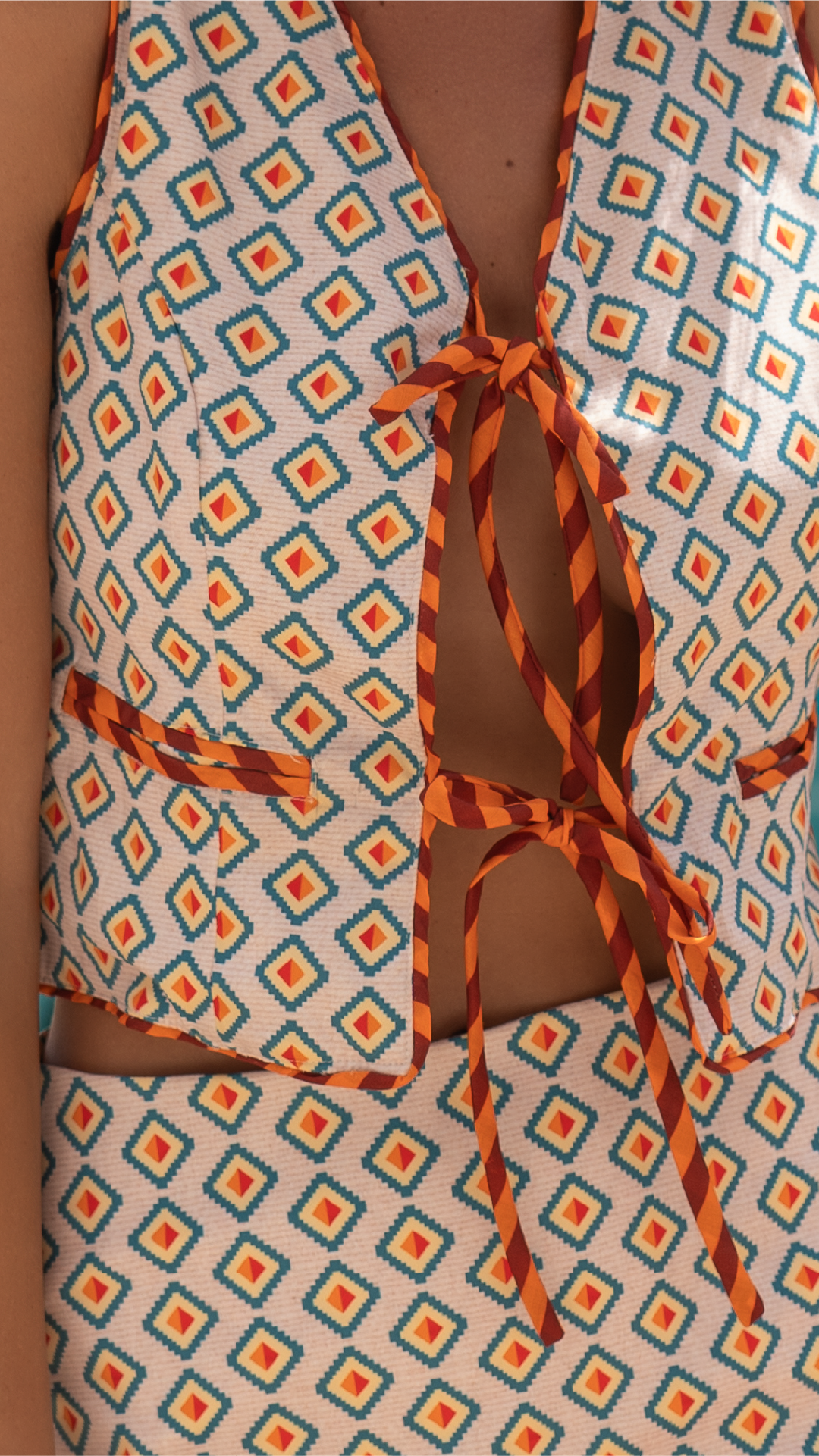 Se compone de un chaleco corto sin mangas, confeccionado en una tela estampada con figuras geométricas en tonos cálidos. Abertura en la parte delantera con tiras largas para amarrar en lazo, lo que le da un toque romántico y versátil. La parte inferior es una falda corta con boleros, diseñada en bloques de rayas verticales y diagonales en colores naranja quemado y azul, que aportan contraste y movimiento. El look se complementa con sandalias planas de amarre al tobillo y un bolso tejido tipo canasto, reforzando el estilo veraniego y natural.