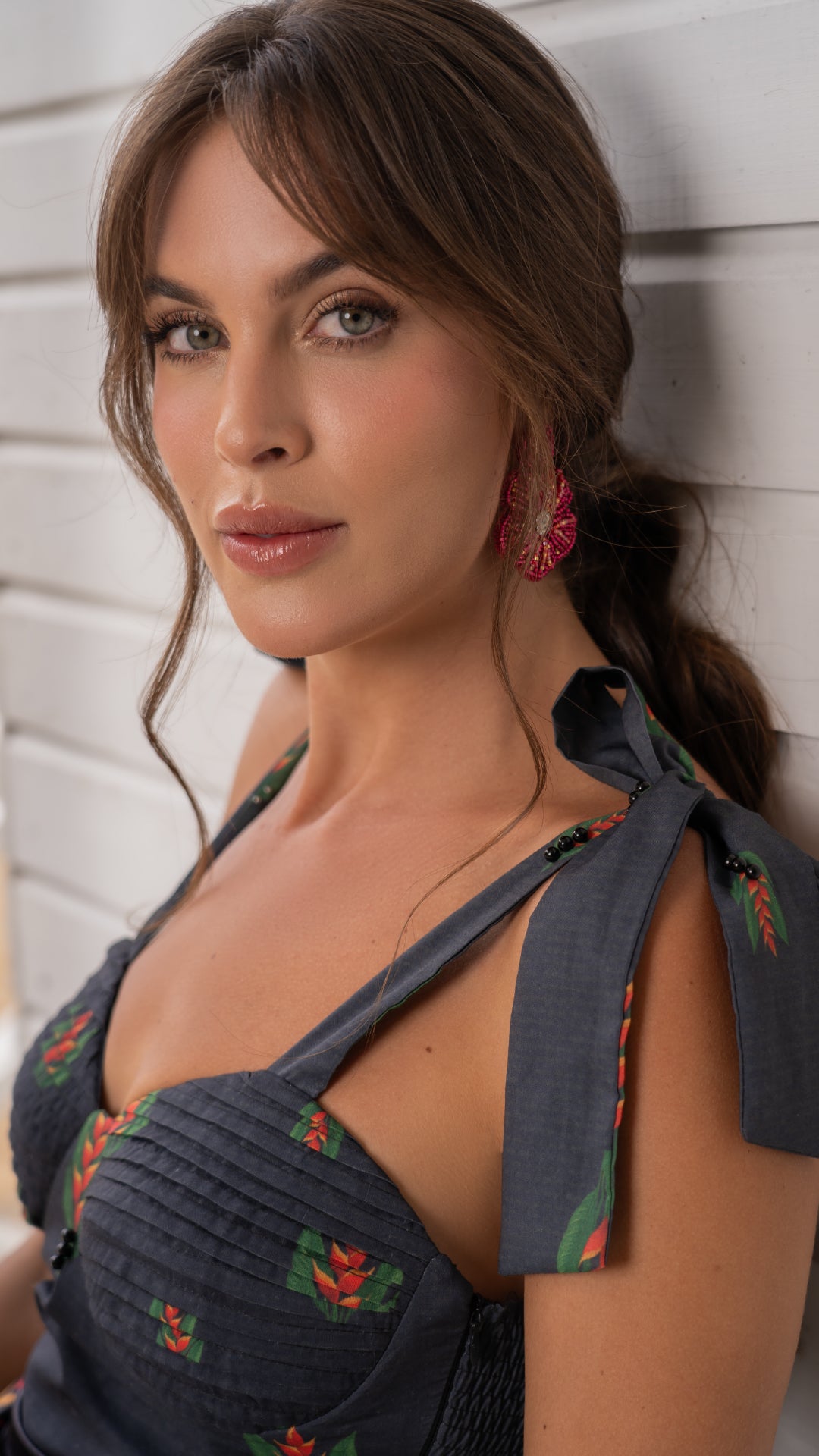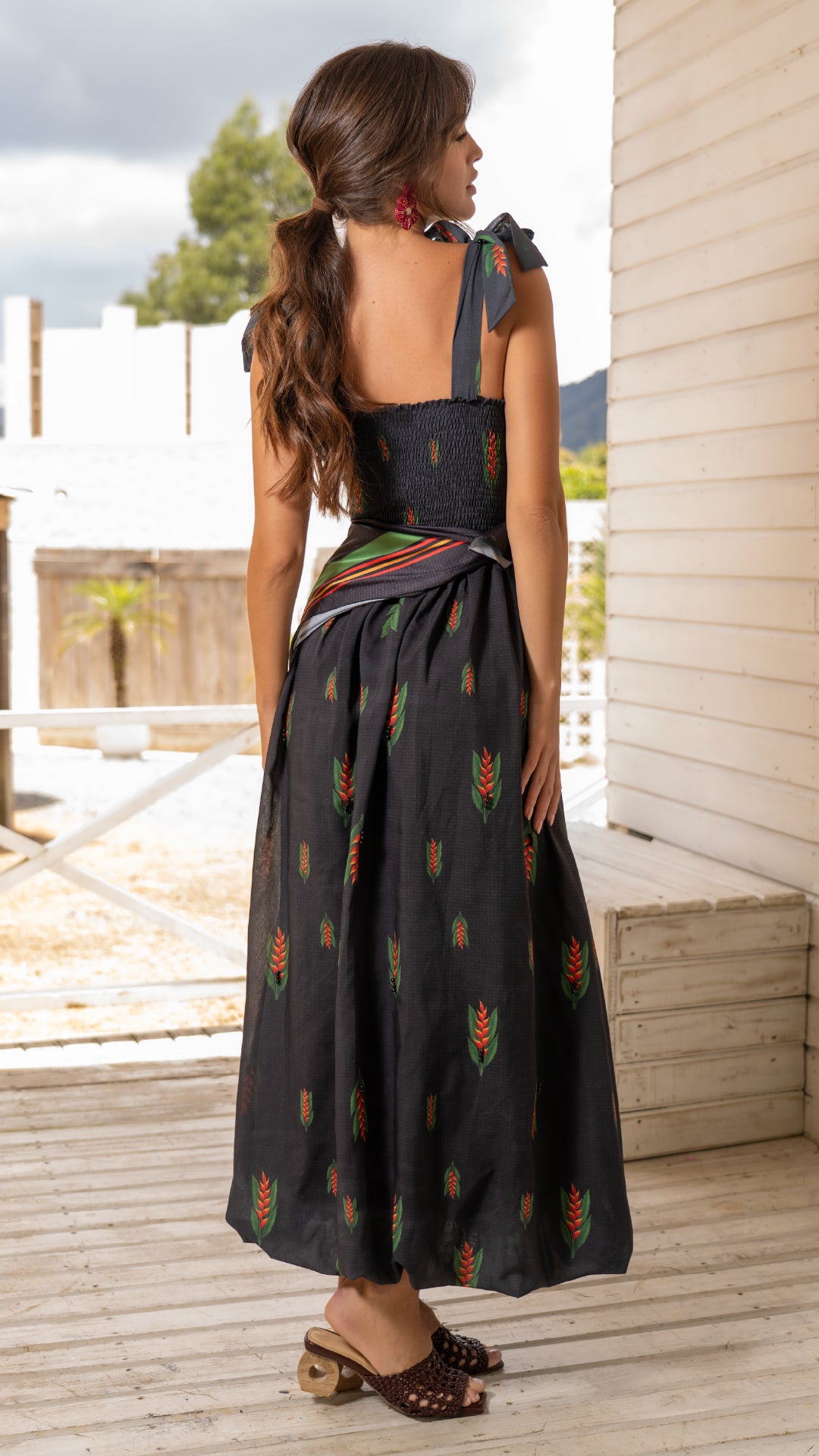Vestido globo a los tobillos, confeccionado en tela fresca con estampado de heliconias tropicales. El corpiño recamado con perlas negras se ajusta con tiras colgantes que forman delicados lazos a cada lado, mientras que la espalda encauchada brinda comodidad y un calce perfecto. Una pañoleta anudada a la cintura resalta la silueta y juega con los colores del estampado. Una pieza única, fresca y sofisticada.