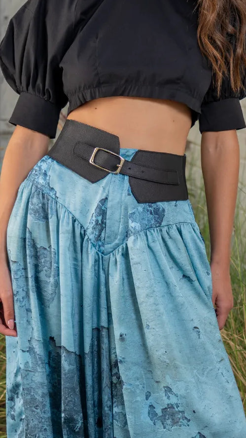 Correa en cuero ancho en tono marrón con diseño de doble pasada y hebilla metálica dorada. Un accesorio elegante y versátil, ideal para resaltar la cintura y complementar vestidos o enterizos con un toque sofisticado.